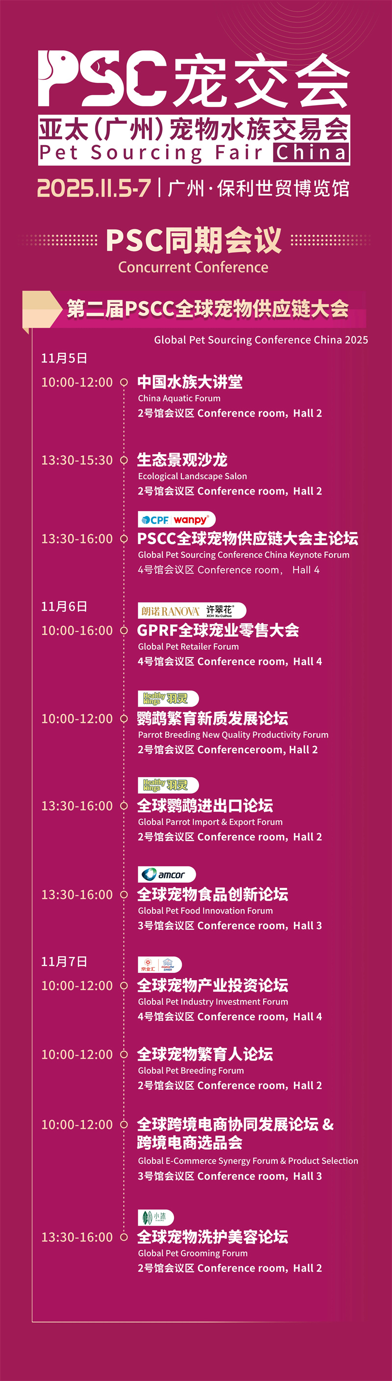 Se llevarán a cabo 11 conferencias profesionales de alta concentración al mismo tiempo, en las que más de 70 líderes de la industria global compartirán sus ideas. La segunda Conferencia Mundial sobre la Cadena de Suministro de Mascotas del PSCC abordará temas populares como la innovación alimentaria, la inversión industrial, el comercio electrónico transfronterizo, la cría y el cuidado personal. La Conferencia Global de Venta Minorista de Mascotas de GPRF abordará directamente los puntos débiles del comercio minorista. Los subsectores también estarán llenos de eventos destacados, incluido el Salón de Conferencias del Acuario de China y el Foro Global de Importación y Exportación de Loros, que cubren precisamente los sectores de acuarios y mascotas pequeñas. Esta exposición, que cubre todas las dimensiones de las necesidades, desde la tecnología práctica hasta la planificación estratégica, ofrece ideas y soluciones de vanguardia para el desarrollo de la industria de las mascotas. Los arreglos específicos son los siguientes: