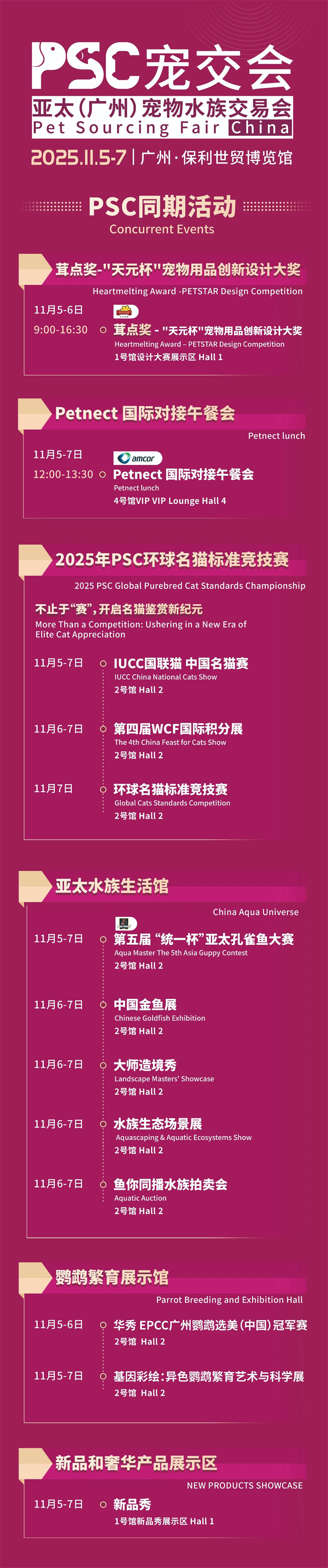 Competiciones destacadas:La Competencia Global Cat Standard PSC 2025 se llevará a cabo del 5 al 7 de noviembre en el Pabellón 2, incluida la Exposición Nacional de Gatos IUCC (5 al 7 de noviembre), la 4ta Exposición Internacional de Puntos WCF (6 al 7 de noviembre) y la Competencia Global Cat Standard (7 de noviembre), marcando el comienzo de una nueva era en la apreciación de los gatos con pedigrí; Exposiciones temáticas: El pabellón de estilo de vida del acuario de Asia y el Pacífico se presentará en el pabellón 2 del 5 al 7 de noviembre y cubrirá la quinta competencia de guppys de Asia y el Pacífico "Copa Unificada", la exposición de peces de colores de China, la exposición de creación maestra y la exposición de escenas ecológicas del acuario. La subasta de acuarios "Fish and You Broadcast Together" se llevará a cabo simultáneamente los días 6 y 7 de noviembre; La Sala de Exposiciones de Cría de Loros albergará el Campeonato de Belleza de Loros de Guangzhou (China) Huaxiu EPCC en el Salón 2 del 5 al 6 de noviembre, y la "Exposición de pintura genética: arte y ciencia de la cría de loros de diferentes colores" se llevará a cabo del 5 al 7 de noviembre, cubriendo subcampos como acuarios y loros.